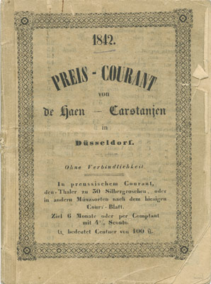 1823-26 beteiligt sich Wilhelm de Haen (1791-1862) an der Material- und Drogenhandlung Curtius, Carstanjen & de Haen. Ab 1827 führt er die Geschäfte unter der Firmierung „H. Nierstraß & de Haen“ in Duisburg weiter (1827-1841). Bittere Erfahrungen macht er 1833 mit süßen Geschäften. Eine Zuckerrübenfabrik, in die er die Hälfte seines Vermögens investiert, arbeitet mit großen Verlusten. Aufgefangen werden sie von den ertragreichen Handelsgeschäften. Zukünftig folgt er bei Unternehmensinvestitionen dem klugen Rat seiner Frau (geb. Carstanjen): „Lege allen Fleiß in deine Arbeit; dein Geld aber stecke nur in Sachen, die du gründlich verstehst.“