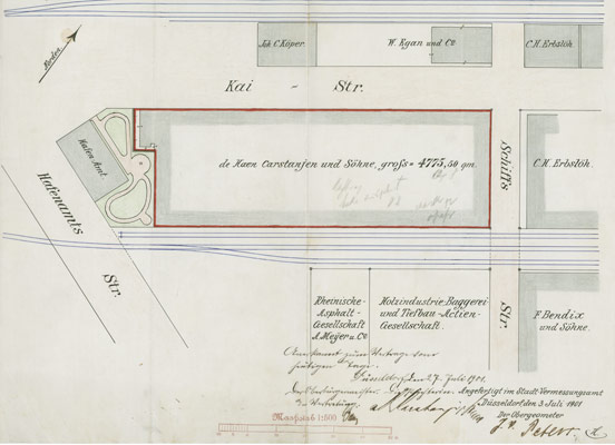 de Haen-Carstanjen & Söhne zieht in den Düsseldorfer Handelshafen. Das erste in Erbpacht gepachtete Gebäude rüstet Adolf Siegert, sparsam wie er ist, mit veralteten Maschinen aus, was den ersten Fabrikationsversuch scheitern lässt. Daraufhin konzentriert er sich wieder auf den lukrativen Handel. Er vergrößert das Firmengelände und baut 1902 das Lagergebäude, das bis heute an dieser Stelle steht: als erste Lagerhalle aus Eisenbeton im Rheinland unter Denkmalschutz. Das Gebäude zeigt deutliche architektonische Parallelen zu der von Schinkel entworfenen Königlichen Bauakademie am Werderschen Markt in Berlin.